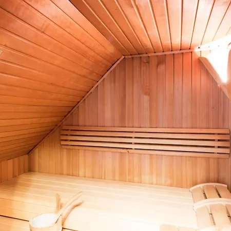 A walk-in shower, a sauna, and a separate toilet are in the bathroom.